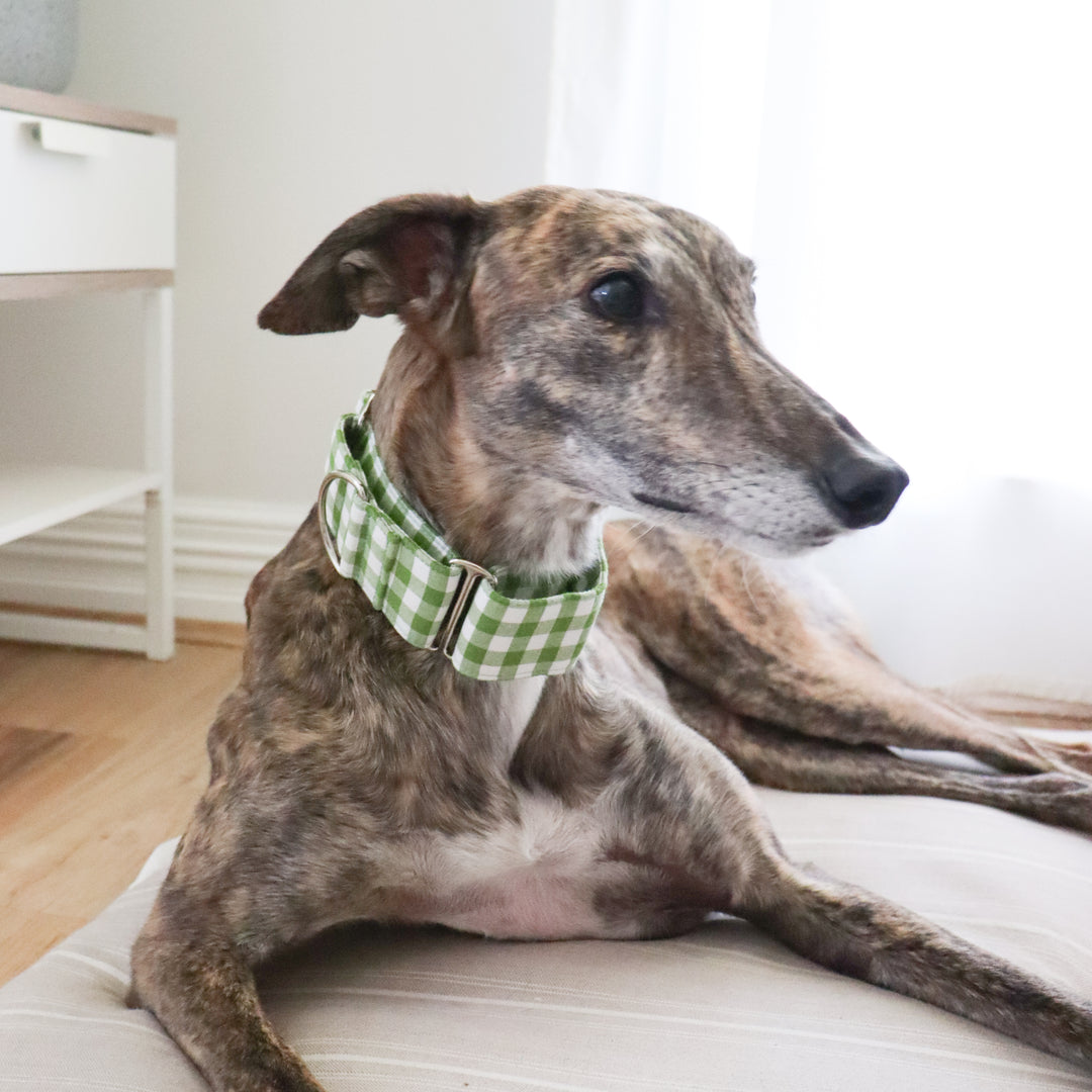 This special Martingale Dog Collar is perfect for your cool greyhound, Italian greyhound, or speedy whippet. The lovely olive green gingham print will give your long friend a standout style!