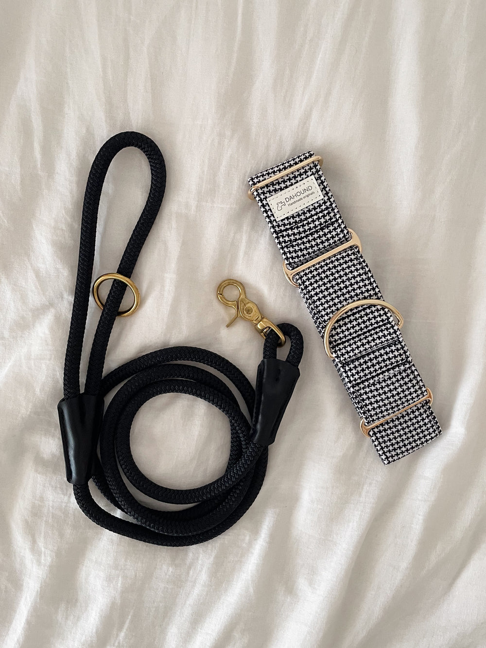 Martingale Collar & Rope Lead Set | Classic Houndstooth (Textured Weave) With Black Leash