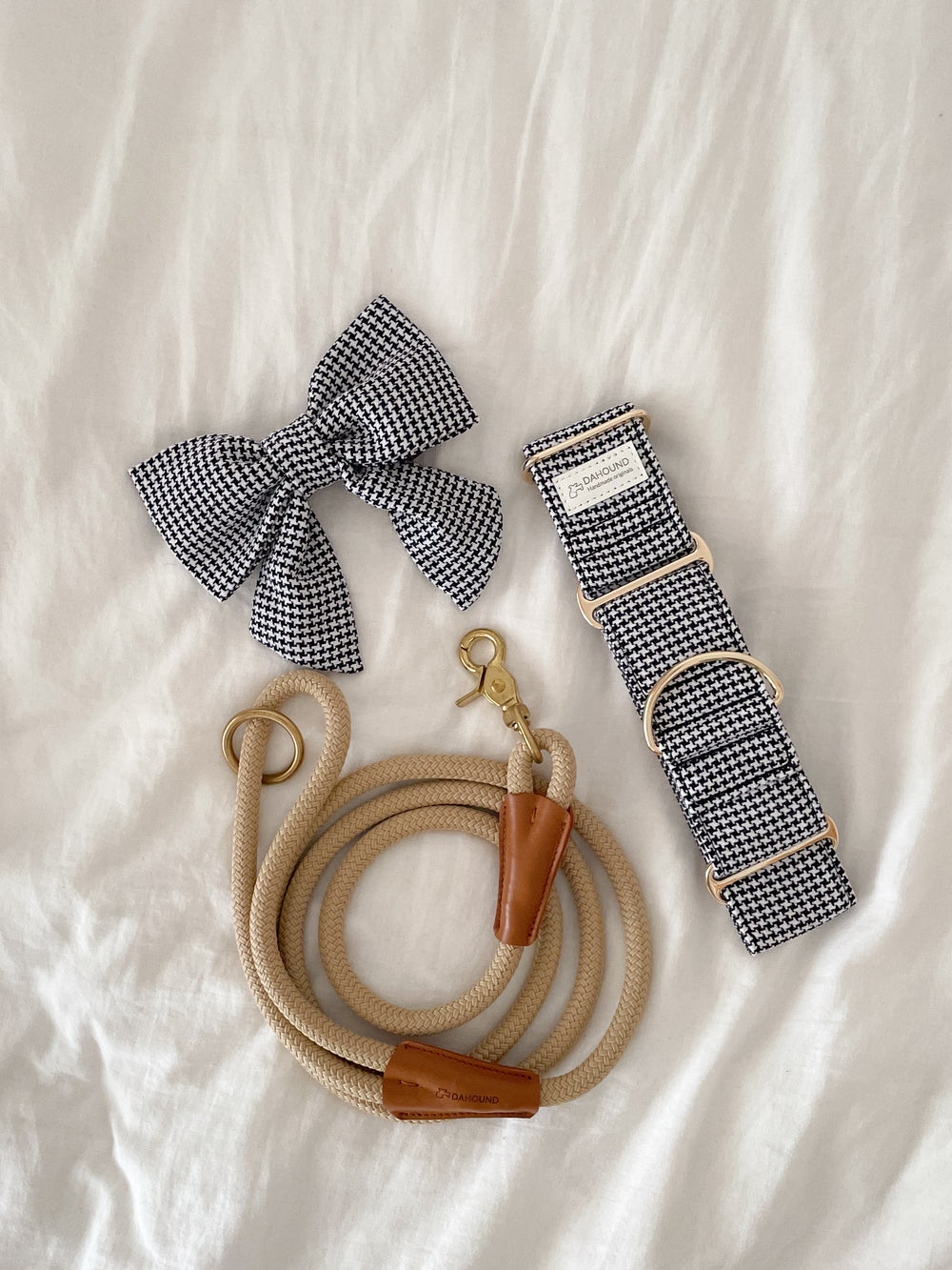 Martingale Collar + Sailor Bow + Rope Lead Set | Classic Houndstooth (Textured Weave) With Beige Leash